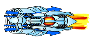 ينتقل هذا الهواء المضغوط الى غرفة (او غرف) الاحتراق ويختلط بالوقود حيث يتم اشعال وحرق هذا الخليط، من نتائج الاحتراق -كما تعلمون- تمدد الغازات. تتمدد الغازات وتخرج بسرعة فائقة من مخرج العادم بعد ان تمر من خلال طبقة (مرحلة) او طبقات من العنفات (التوربينات) التي تعمل على تدوير المراوح الامامية والضاغطة وباقي أجزاء المحرك.